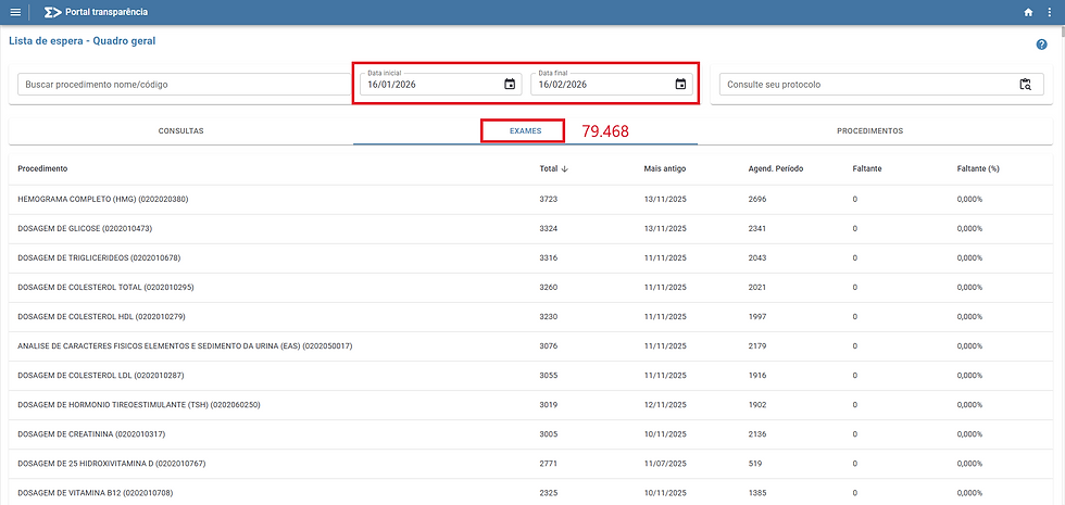 Contando com o dia 02/02/26 (pois o prefeito falou que no mesmo dia já estariam trabalhando para diminuir as filas) nossa equipe esperou então 15 dias e fomos verificar os números. Números estes do próprio portal da transparência da saúde municipal e que o poder executivo não tem como combater ou contestar, pois são a sua realidade e a demanda alimentada diariamente no sistema oriundas das necessidades da sociedade e dos cidadãos que dependem do sistema público de saúde.