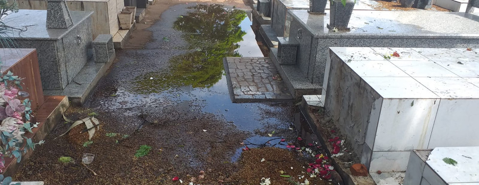 O interior do local nas vias internas está intransitável. Tomado pelo mato, restos de material de construção jogado de qualquer jeito por todo lado. Carneiras abandonadas no meio da construção, túmulos danificados.